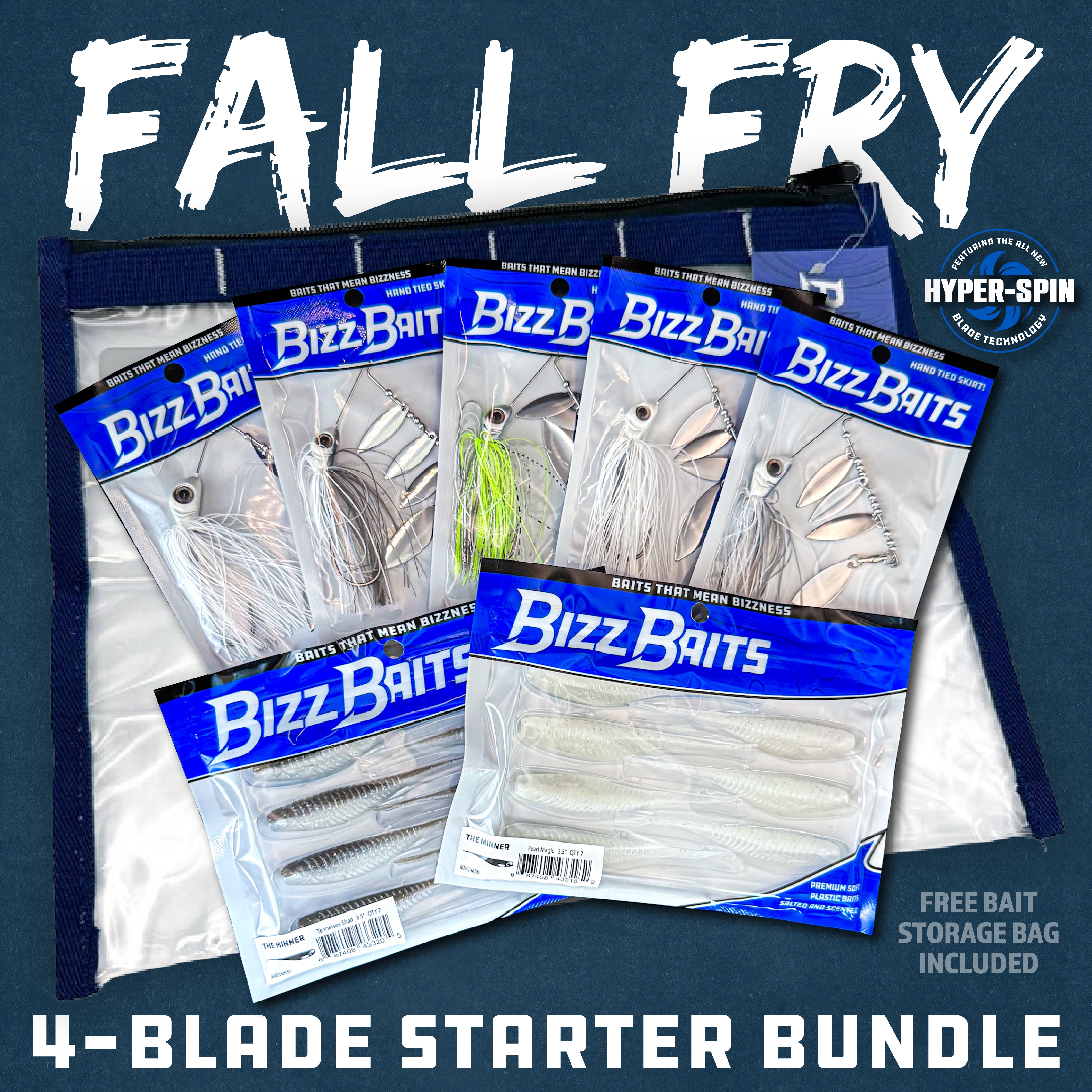 The ultimate way to fish the fall fry bite is here. The Fall Fry 4-Blade Starter Bundle combines our limited-edition multi-blade spinnerbaits with matching soft plastics, all designed to perfectly imitate schools of fry bass can’t resist.